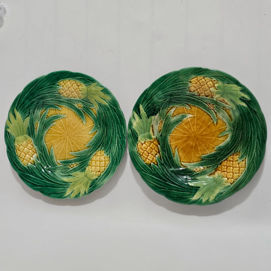 Fine Pair of George Jones Majolica Pineapples on Basketweave Plates, English, ca. 1870