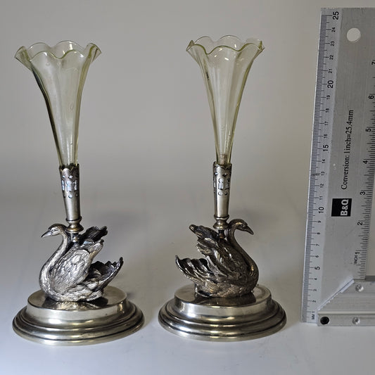 Unusual Pr Silver Plated Swan & Glass Epergnes c1880