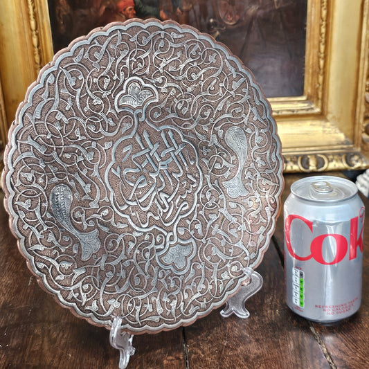 Interesting 19thc Persian Silver Inlaid Copper Dish On Three Brass Cabochon Feet