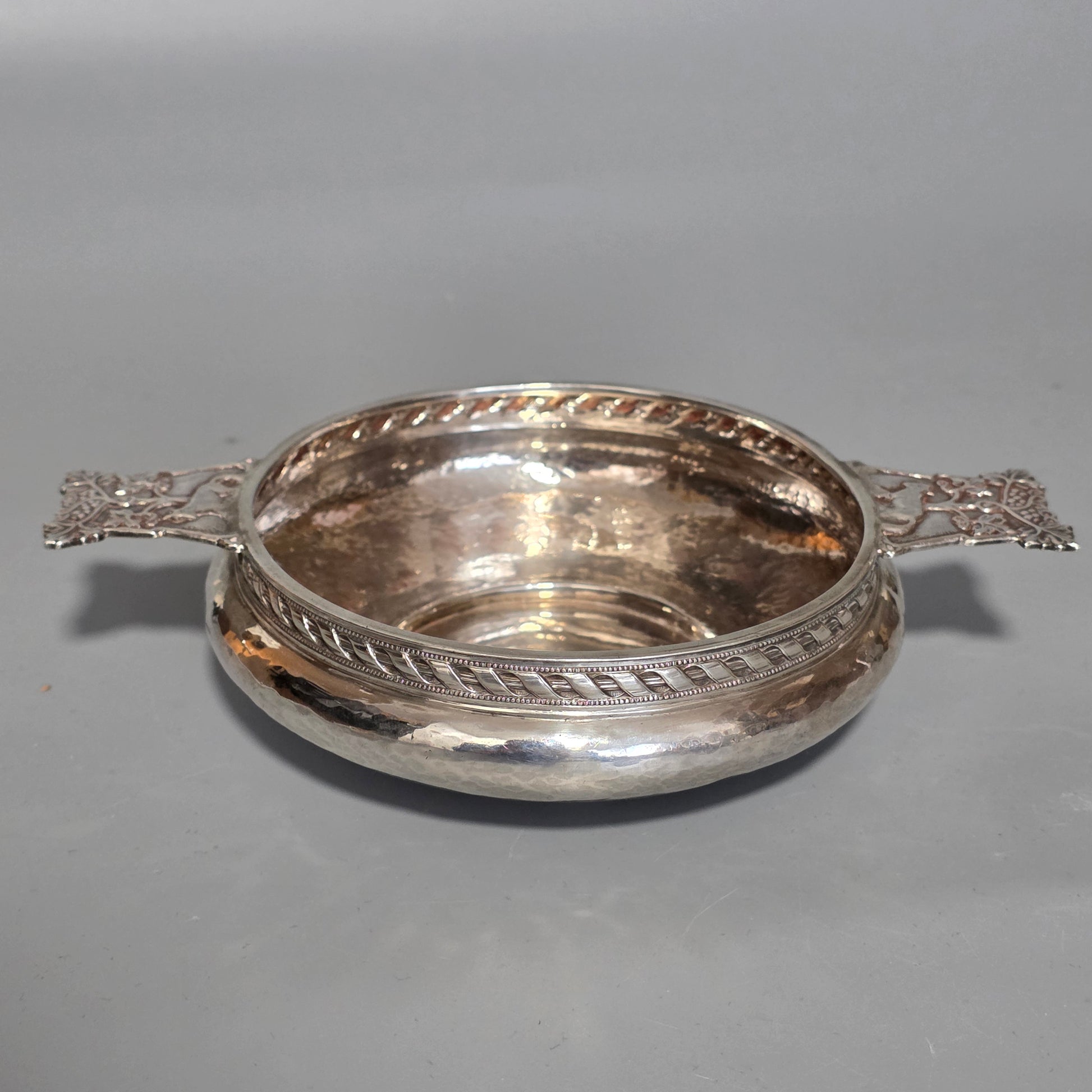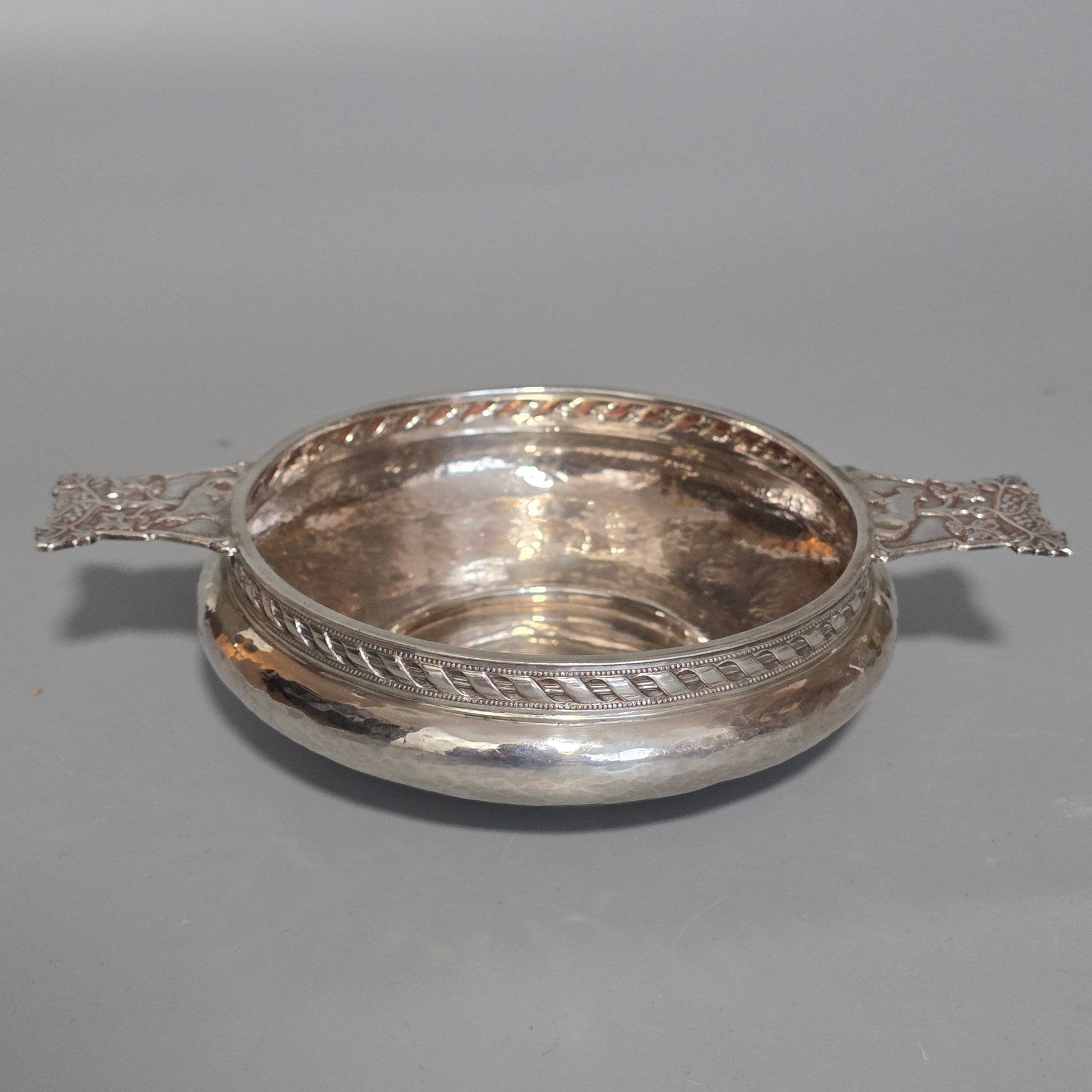 Silver quaich by A E Jones, Birmingham, 1916, delightful planished finish to the body, beautifully detailed handles in traditional Arts and Crafts styling. Made from a heavy gauge of silver, weighing 140g.