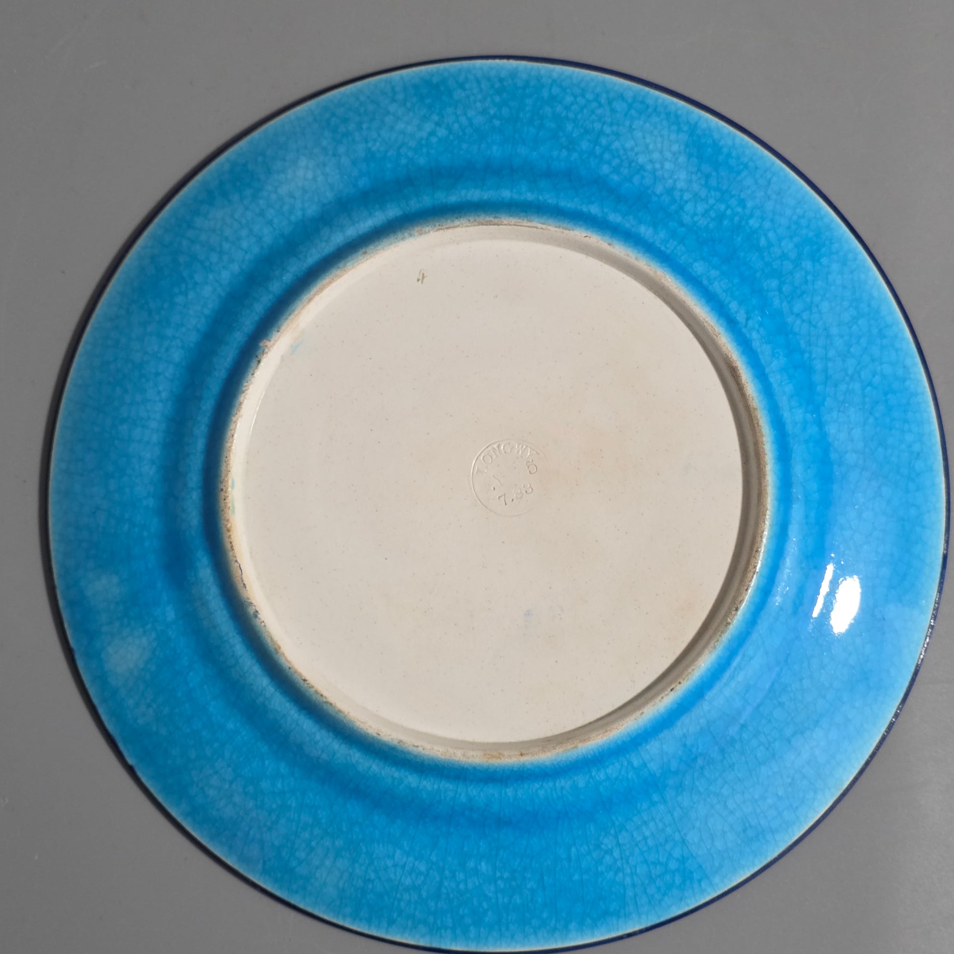 The plate displays rich, vibrant enamels, with no visible cracks or chips and only light surface marks commensurate with age and use. It measures 20.3 cm in diameter and is further enhanced by a deep turquoise-blue border on the underside, adding to its visual appeal.