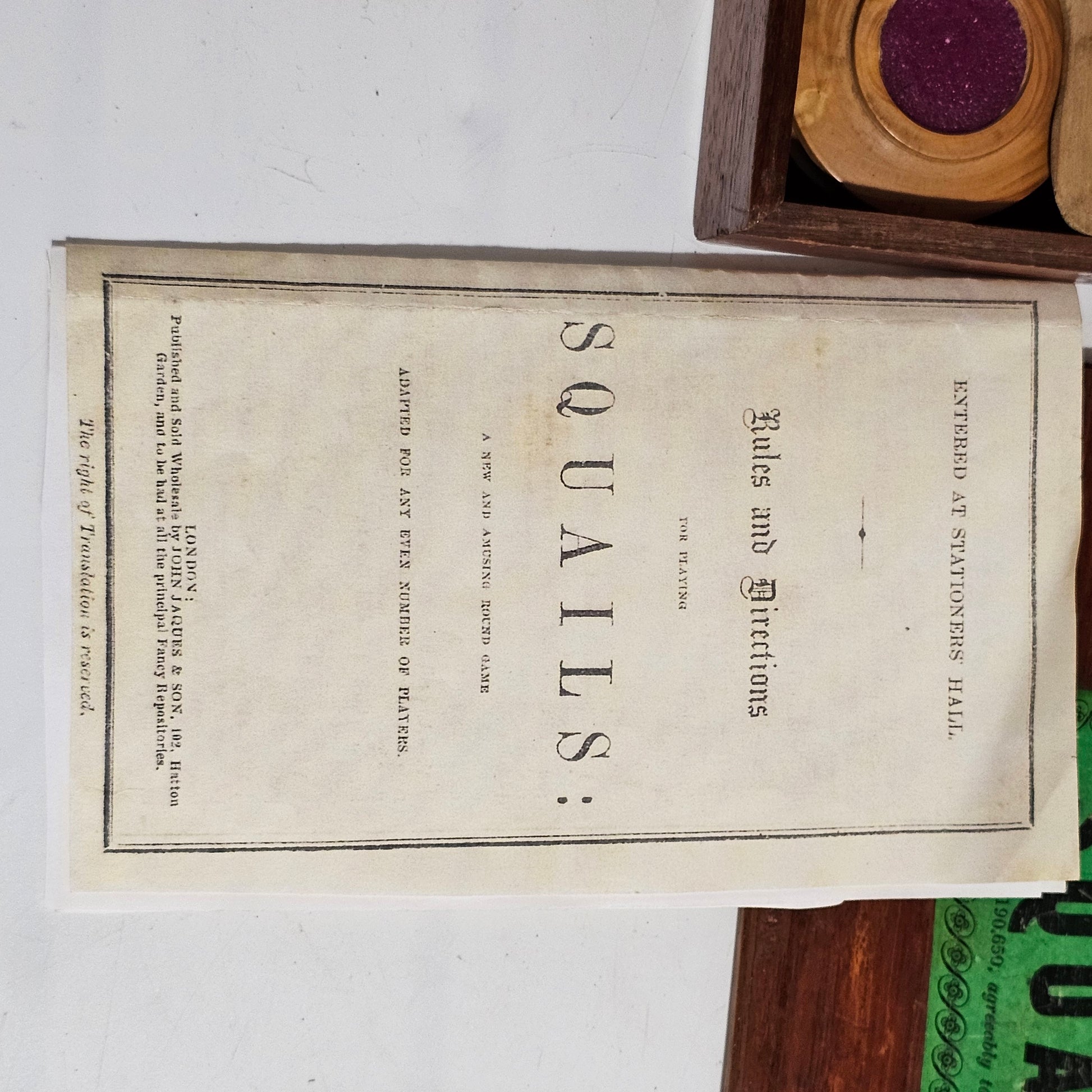 Introducing Squails, a vintage game crafted by Jaques of London in 1839. This remarkable set features an excellent condition slide-lid box, adorned with its original green paper descriptive label on the lid.