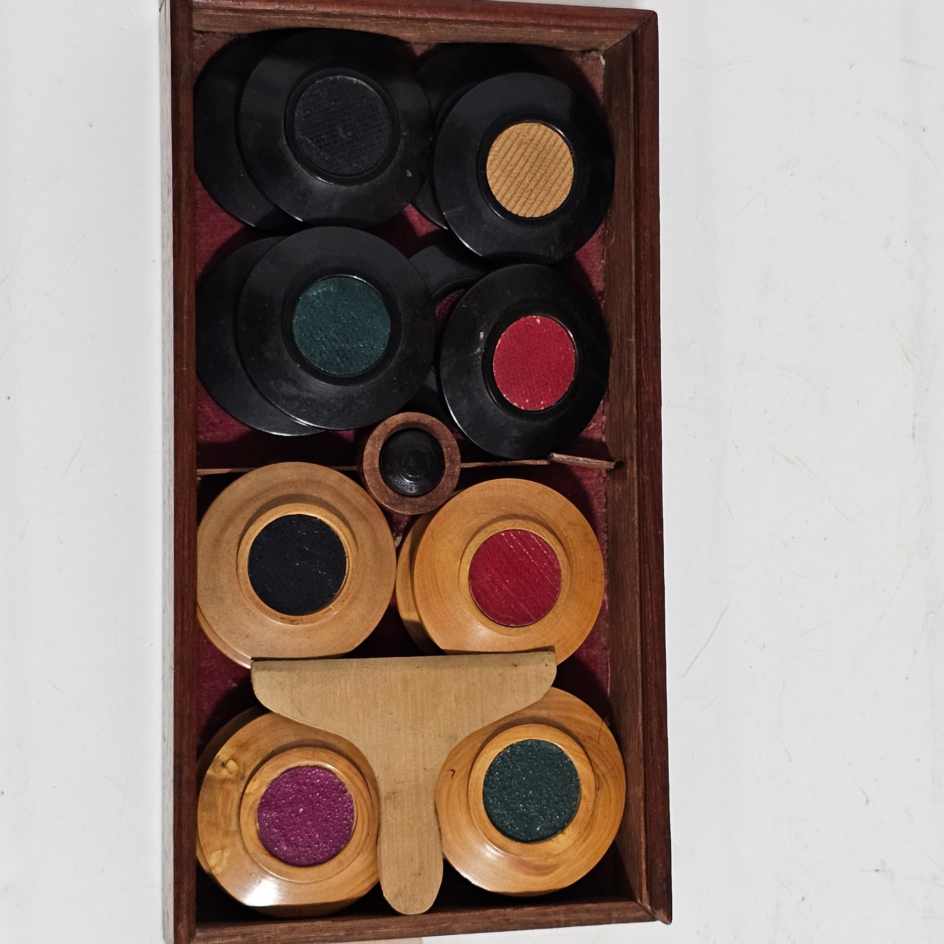A fine example in its original mahogany box with sliding lid, retaining the original Jaques label. The set contains wooden discs, a lead jack, and a swoggle/measurer.