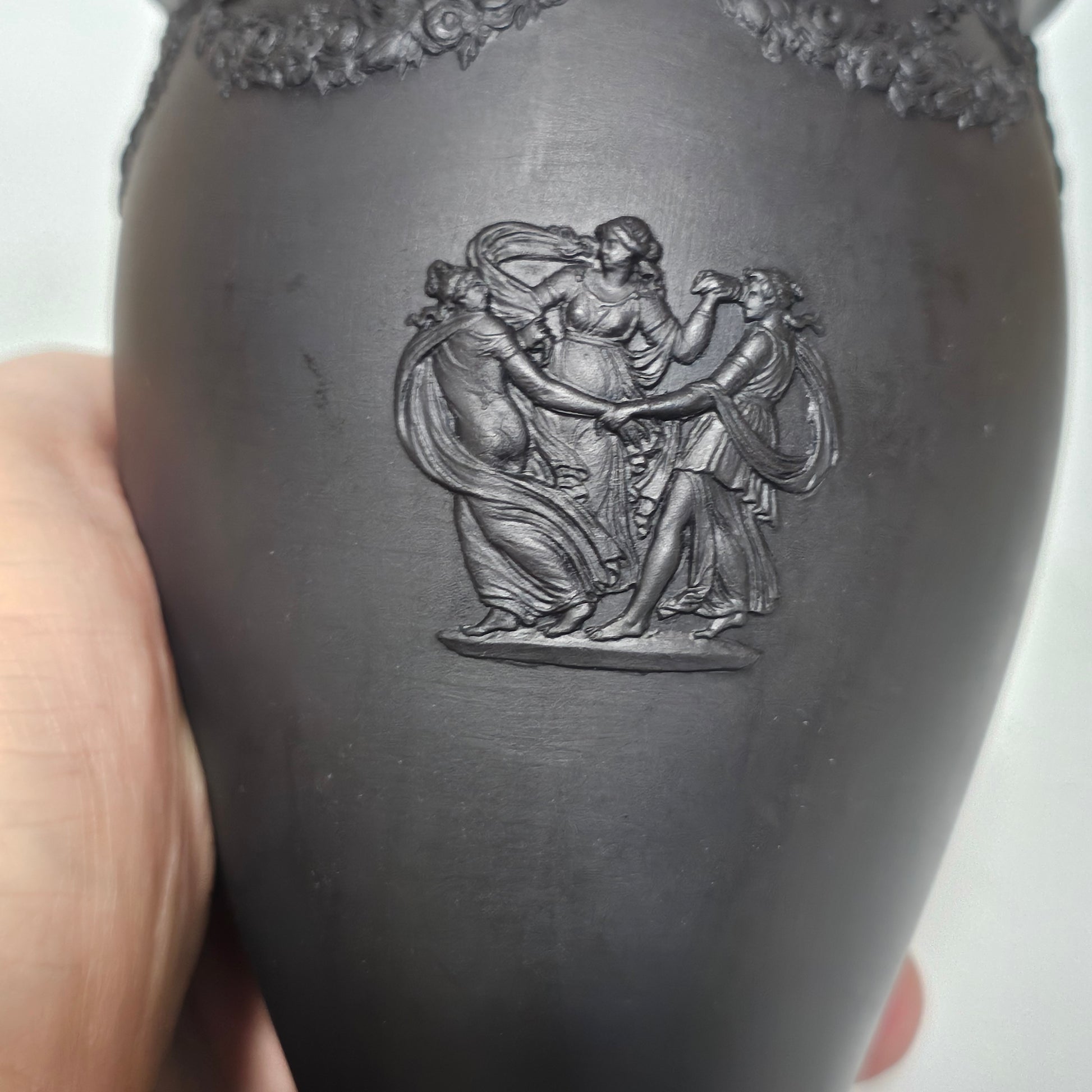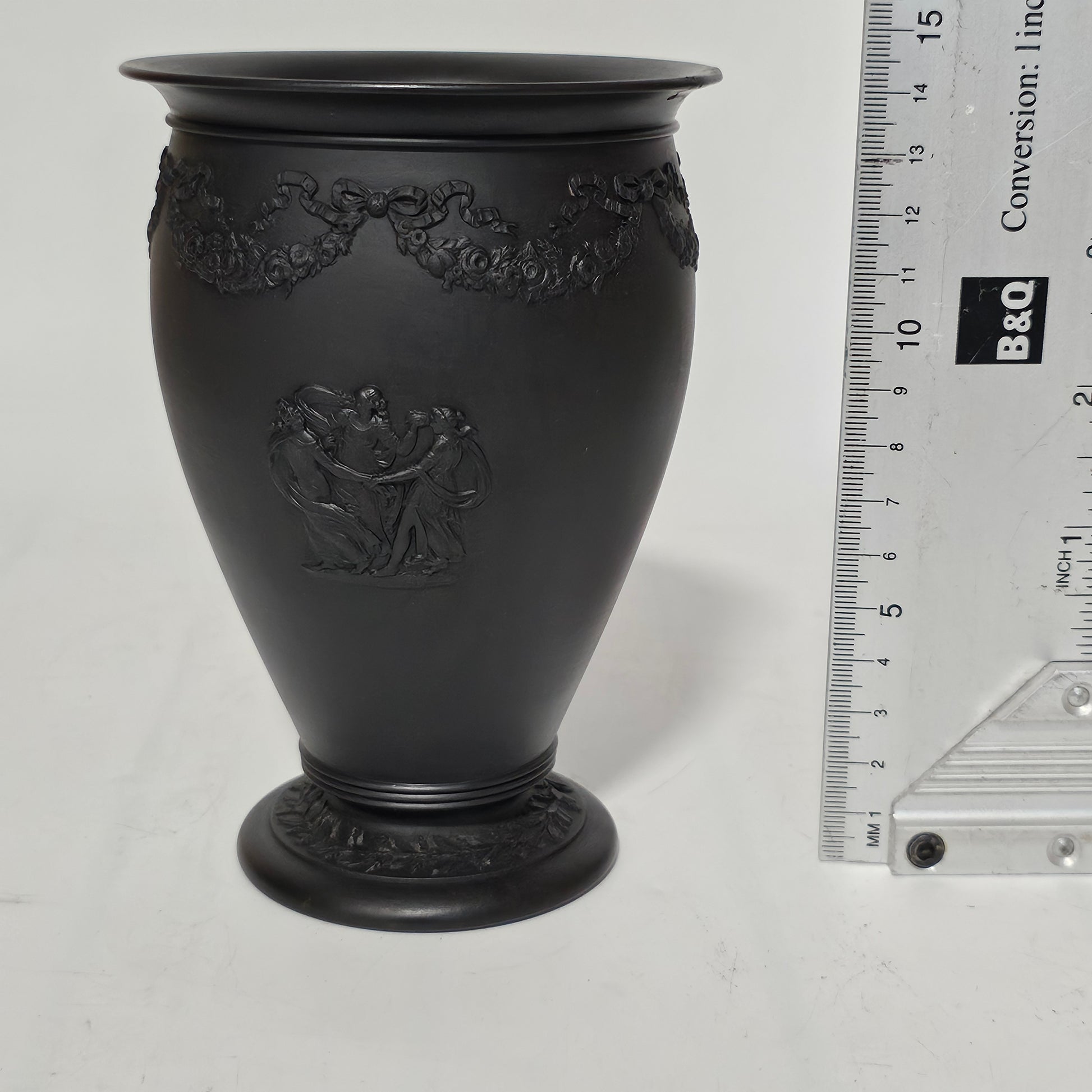 Very fine quality late 18th/early 19thc Wedgwood black basalt vase of waisted design with clasic scenes and bow and swag border around the top edge. impressed ''WEDGWOOD'' to the base. A beautiful example in lovely order.