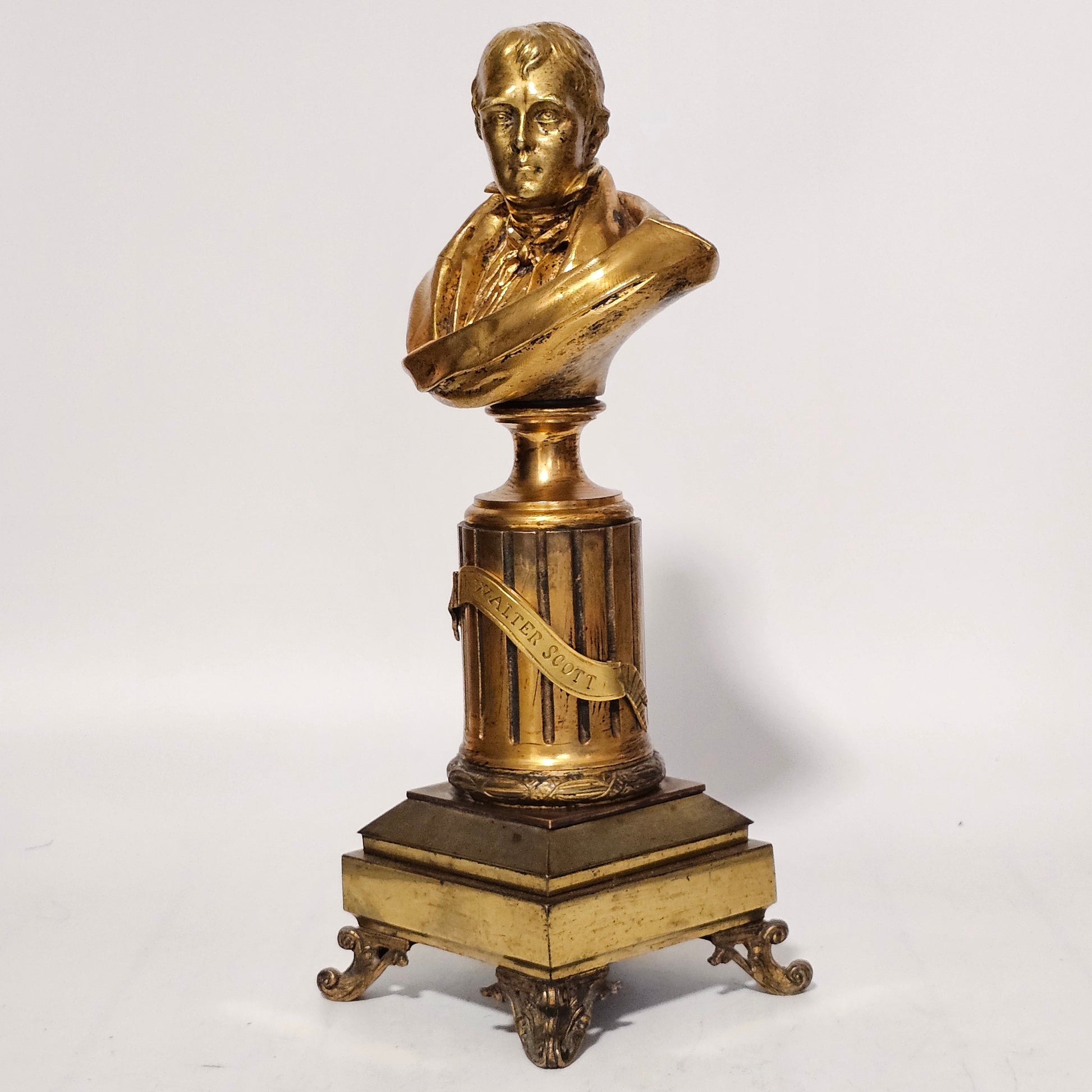 A fine 19th century gilt bronze bust of Sir Walter Scott (1771–1832), elegantly mounted on a fluted bronze column with a stepped base. Beautifully cast and detailed, this classical portrait captures the distinguished features of the famed Scottish novelist and poet, author of Ivanhoe and Waverley.