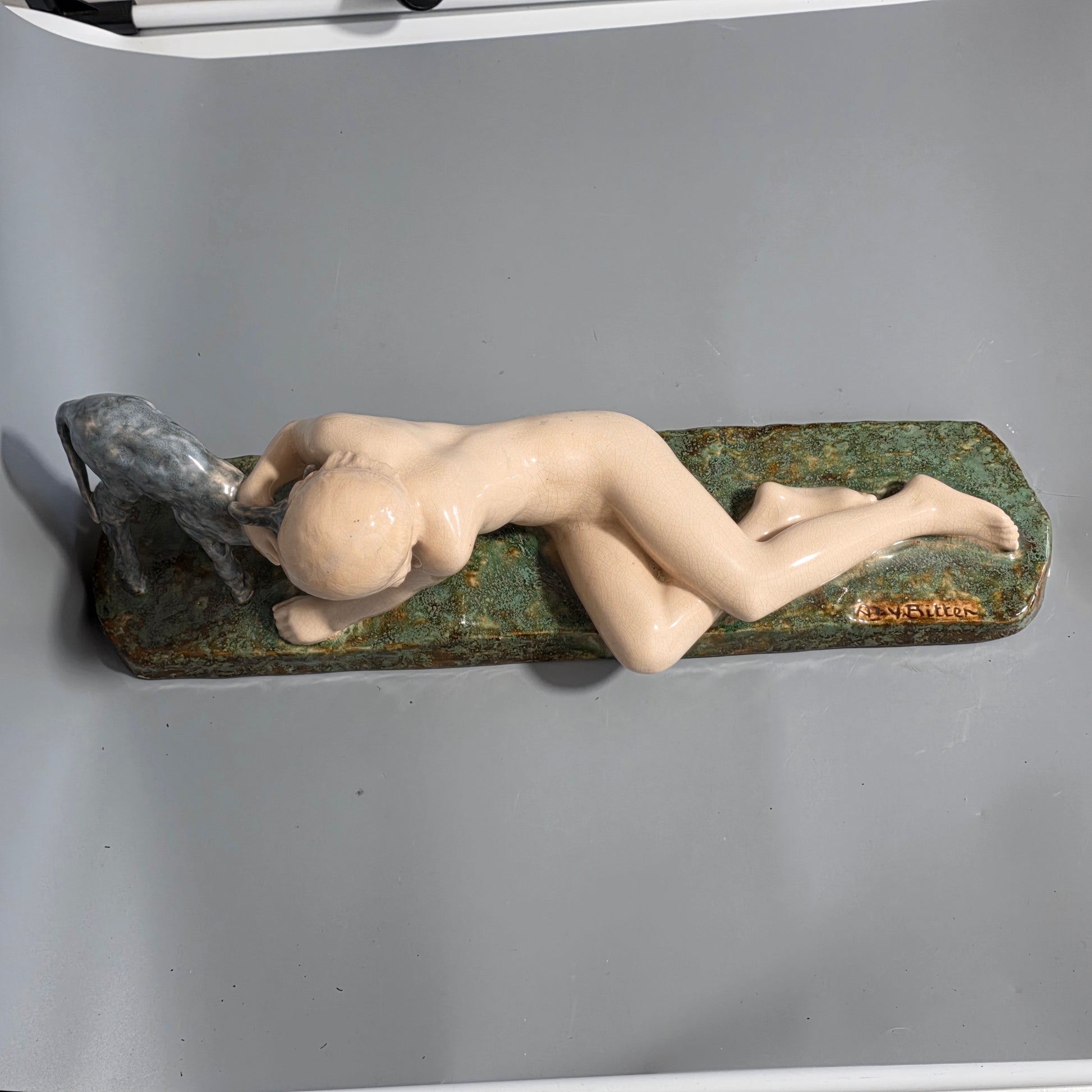 A beautiful glazed terracotta Art Deco sculpture by renowned French artist Ary Bitter, depicting a young nude woman gently petting a lamb. The semi-reclining figure has a serene, natural expression, perfectly capturing Bitter’s sensitivity to form and movement.