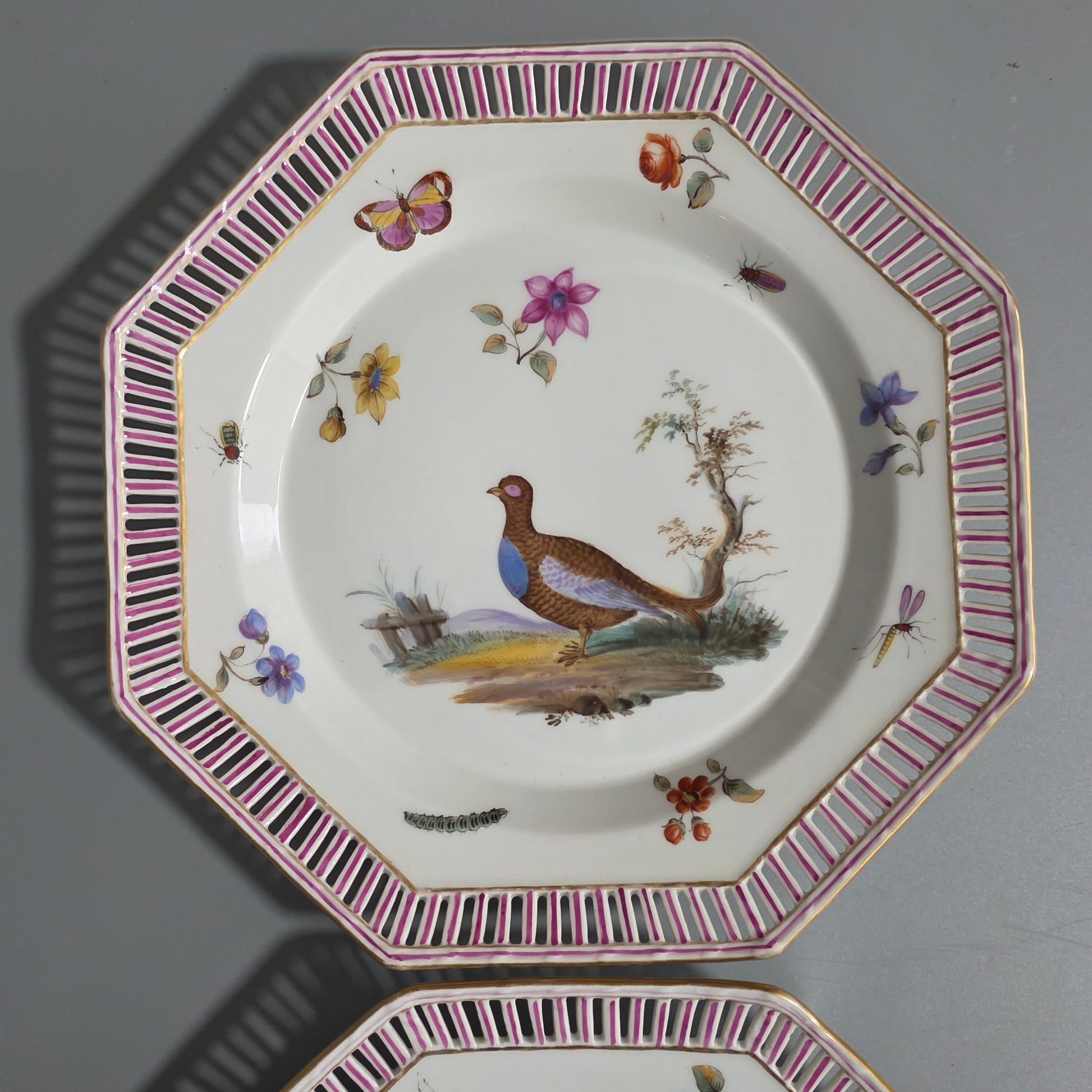 A KPM Berlin porcelain Octagonal fretted bird plate hand painted with birds and insects. Reticulated rim with arched detail and painted line work. Pink fretted rim. Blue sceptre mark to the reverse and incised marks near the foot rim.